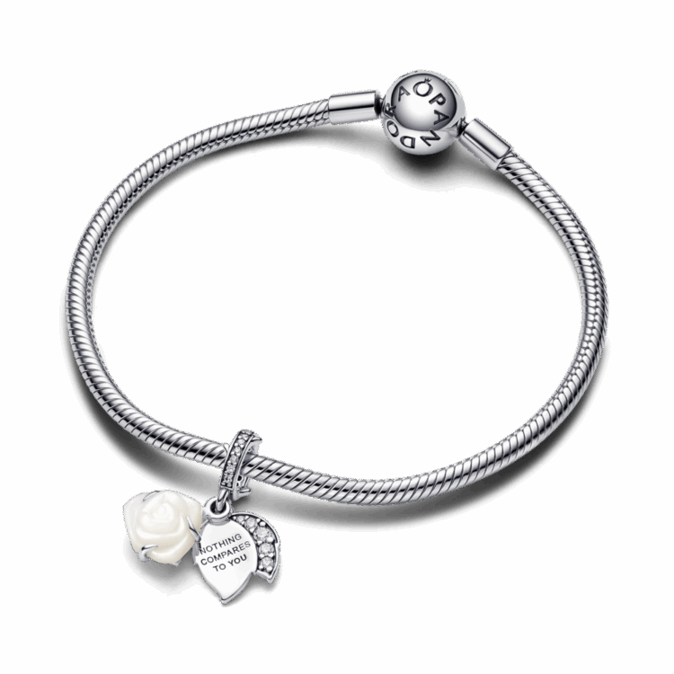 אלגנטיות מתעוררת לחיים עם תליון הורד הכפול שלנו מקולקציית פנדורה מומנטס. עשוי כסף סטרלינג עם ורד לבן בגימור פנינה בעבודת יד מוקפדת. שכבות עלי הכותרת לוכדים את מהות הפריחה. התליון מעוטר בזרקונים שקופים מנצנצים והחריטה NOTHING COMPARES TO YOU.