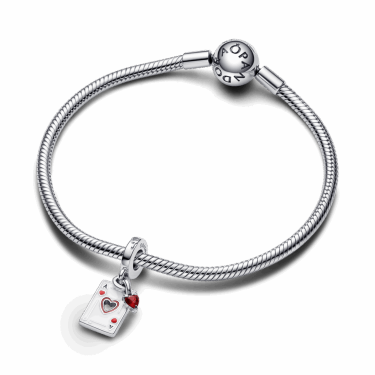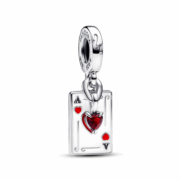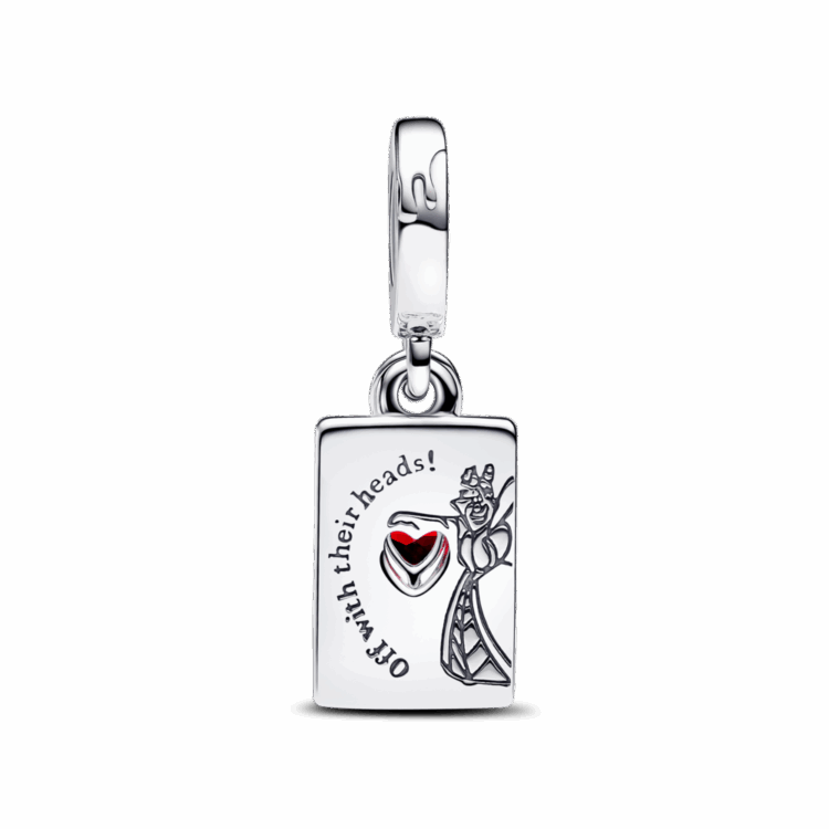 תליון קלף עשוי כסף סטרלינג בהשראת מלכת הלבבות המרושעת מאליס בארץ הפלאות של דיסני. משובץ פרטי אמייל בעבודת יד עם לב קריסטל אדום והכיתוב Off with their heads.