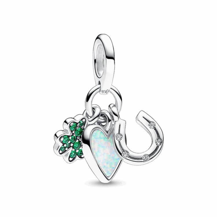 שמרי על המזל קרוב עם תלתן ארבעת העלים, הלב והפרסה. צארמ מכסף סטרלינג הכולל שלושה סמלים שונים של מזל טוב, כולל תלתן בעל ארבעה עלים, לב ופרסה. על הלב חקוקות המילים Sister Hood. הפרסה נוצצת בזרקונים שקופים, הלב נוצץ עם אבן אופל לבנה שנוצרה במעבדה והתלתן כולל קריסטלים ירוקים מלכותיים. ענדי את הקסם הזה של Pandora Moments כסמל למזל טוב והגנה או תני אותו למישהו שממש חשוב לך.