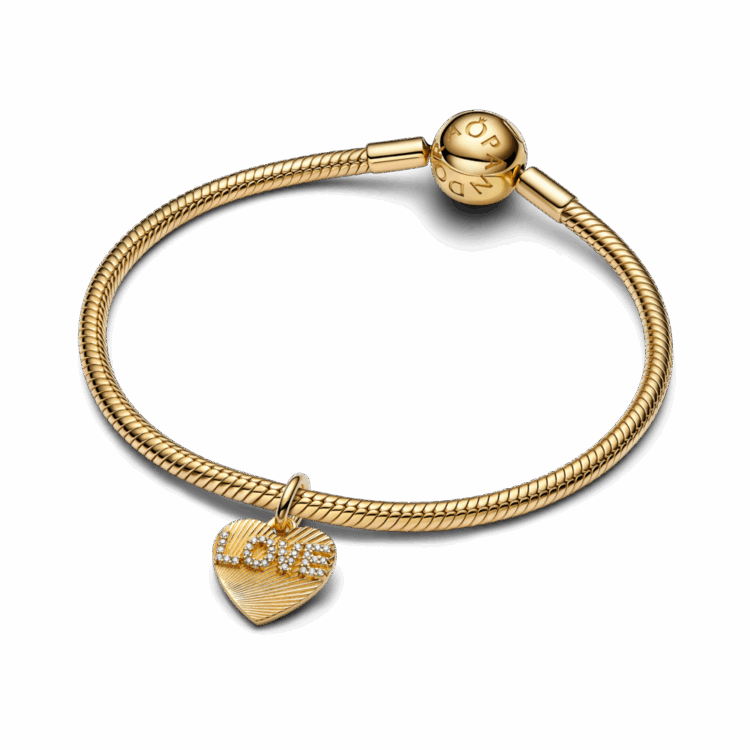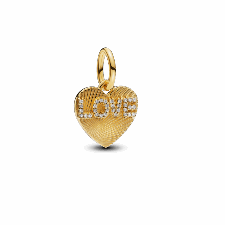 ספרי לכולם על אהבתכם עם תליון לב בציפוי זהב 14 קראט. מעוצב בטקסטורת פסים ייחודית עם זרקונים נוצצים המרכיבים את המילה המרגשת LOVE.