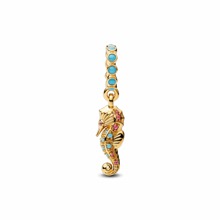 מוכנה לצלול לעומקים חדשים של שיק? תליון ציפוי זהב 14 קראט בצורת סוס ים עם אבני טורקיז בולטות וזרקונים בצבע סגול. סוס הים היא חיה ייחודית הנתפסת כסמל של מזל טוב וכוח, היא מביאה איתה הגנה וסבלנות. הוסיפי אותו לצמיד המומנטס או לשרשרת שלך יחד עם עוד צארמס קיציים ומשמחים.