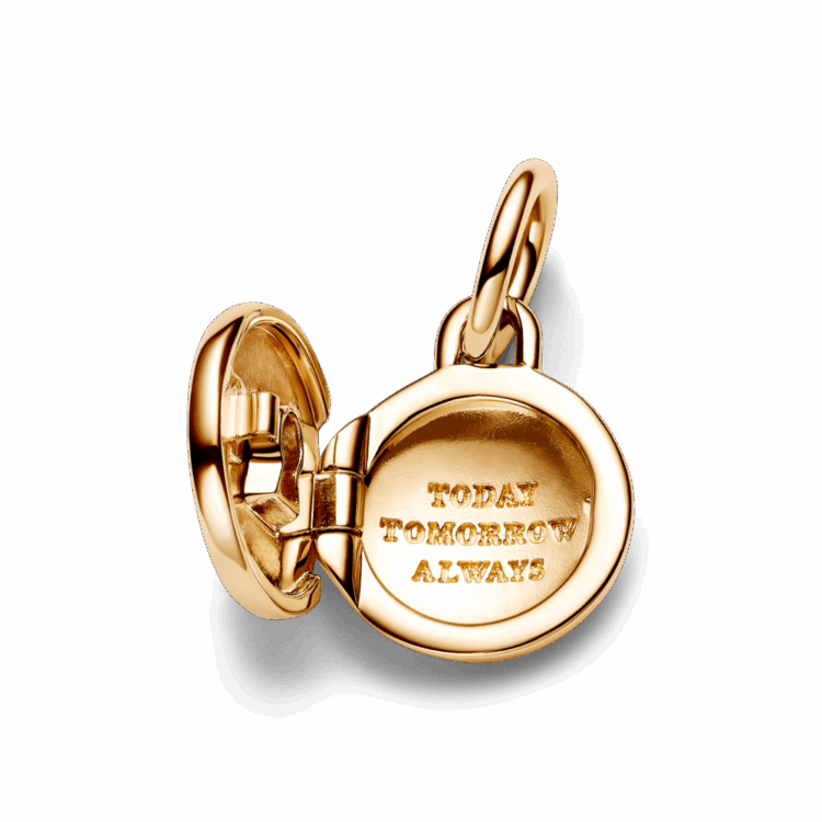 שמרי את מה שיקר לך קרוב ללב עם תליון המנעול שלנו הניתן לפתיחה. מצופה בזהב 14 קראט עם אבן זרקון שקופה בחלק הקדמי בצורת חור מנעול. התליון נפתח ונסגר בצורה בטוחה כך שתוכלי להניח בפנים תמונה קטנטנה או פתק. בחלק הפנימי של התליון מופיע הכיתוב: TODAY TOMORROW ALWAYS. הוסיפי את התליון לשרשרת או לצמיד המומנטס שלך כסמל לשמירה על האהבה שלך ותזכורת להעריך אותה כל יום מחדש.