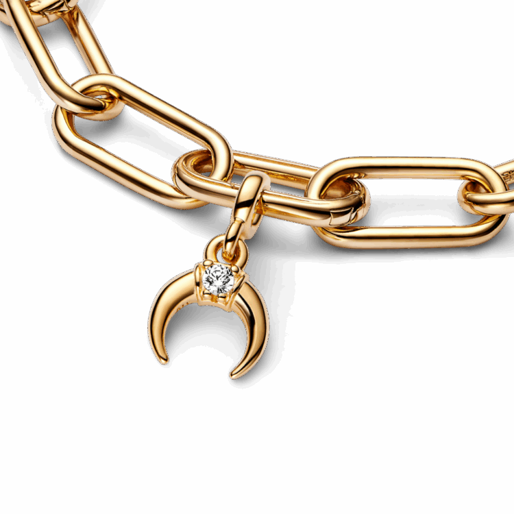 הרגישי מועצמת עם מיני תליון ירח סהר Pandora ME. מיני תליון זה עם גימור ציפוי זהב 14 קאראט חלק מעוצב כמו ירח סהר ומשובץ במרכזו באבן עגולה נוצצת בחיתוך מבריק. הכדור עוצב על מנת לסגנן מחברי סטיילינג בר-פתיחה ועיגולי חישוק מקולקציית Pandora ME. החזיקי תכשיט זה, המסמל יצירתיות וכוח נשי, קרוב אליך ושלבי אותו עם סגנונות אחרים המעניקים השראה כדי ליצור לוק הטעון בוויברציות חיוביות.