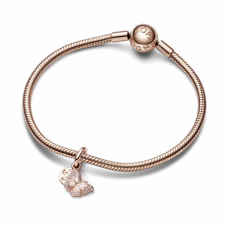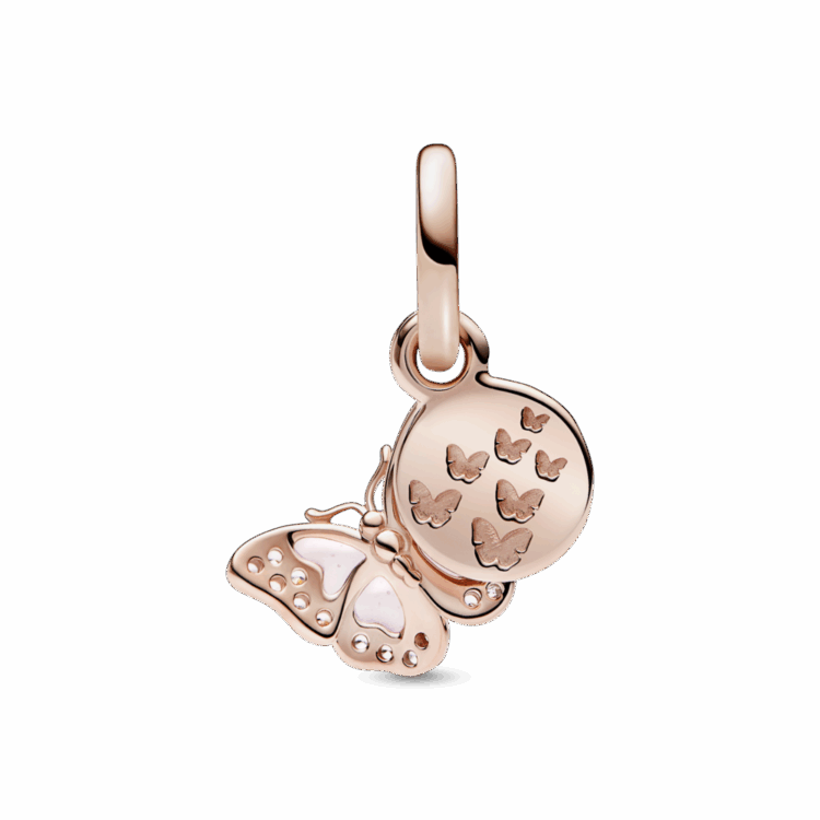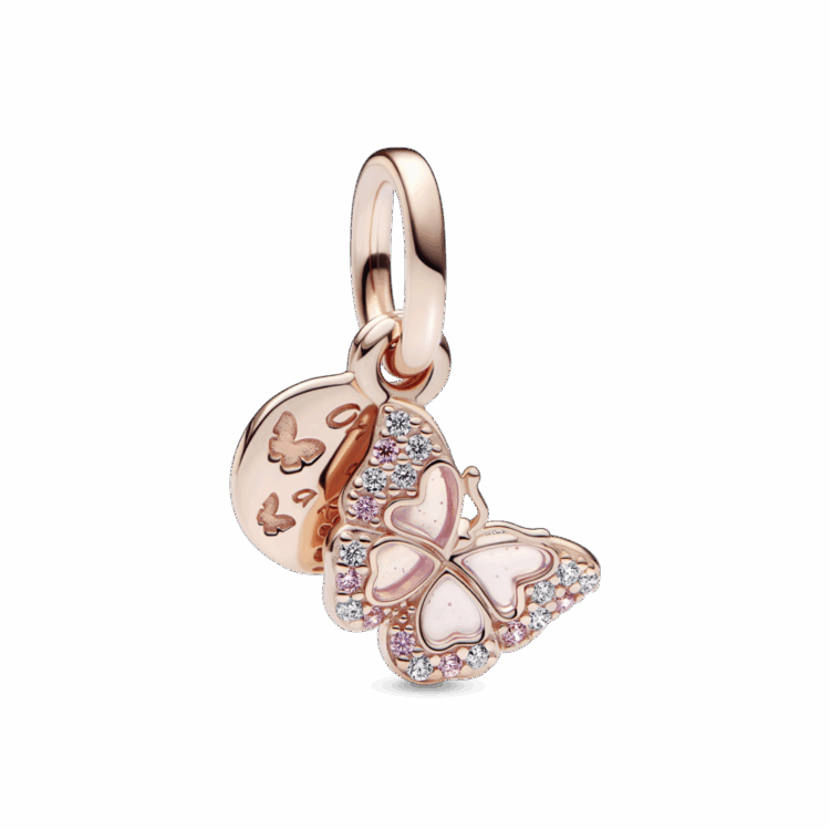 אמצי אל לבך את השינוי עם צארם התליון הכפול שלנו פרפר ורוד וציטוט. צארם התליון מצופה בזהב רוז 14 קאראט בגימור עבודת יד עם פרפר שפרטיו עוצבו מאמייל ורוד שקוף עם חיתוכים המעוצבים בצורת לב בכל אחת מהכנפיים ופאבה נוצץ לאורך הקצוות. כדי לחגוג את היופי והייחודיות של כל פרפר, בצד אחד יש דיסקה עגולה שעליה חרוטה האמירה אחת מסוגה (One of a kind) בצד אחד, ופרפרים מרפרפים משני הצדדים. שלבי והתאימי צארם תליון כפול זה עם תכשיטים אחרים המקבלים את השראתם מהאביב כדי לחגוג את העונה החדשה של התחלות חדשות.