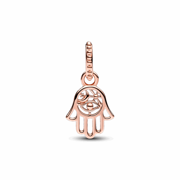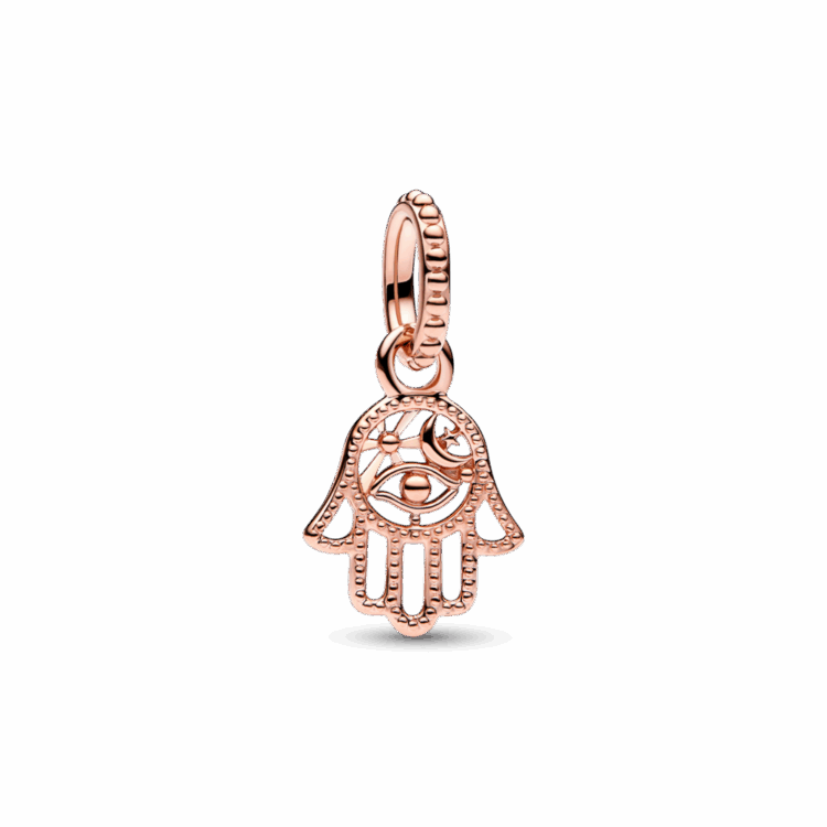 שדרי תמיד אנרגיות חיוביות עם צארם תליון חמסה מגוננת. צארם חמסה זה כולל עיצוב מורכב מעשה תחרה בציפוי זהב רוז 14 קאראט והוא תלוי מוו משובץ חרוזים. מוטיבים של עין, קרניים וירח סהר מופיעים בתוך היד, הכוללת חרוזים חד-צדדיים לאורך המתאר שלה. יד תלויה זו, אותה ענדו באופן מסורתי כקמיע, נחשבת כמחווה המקבלת לתוך חייך בברכה טוב לב, ידידות וחסד.