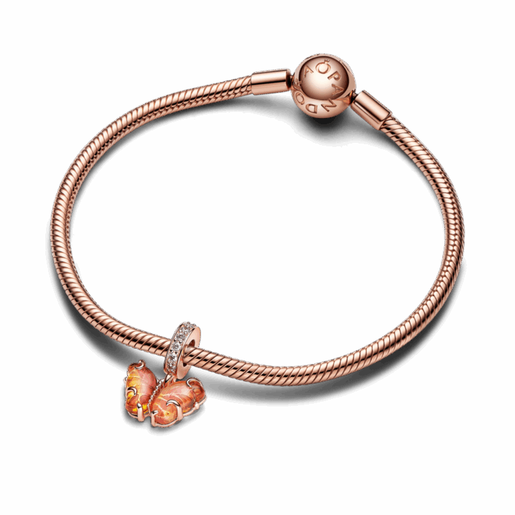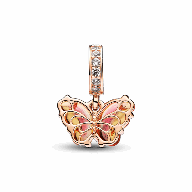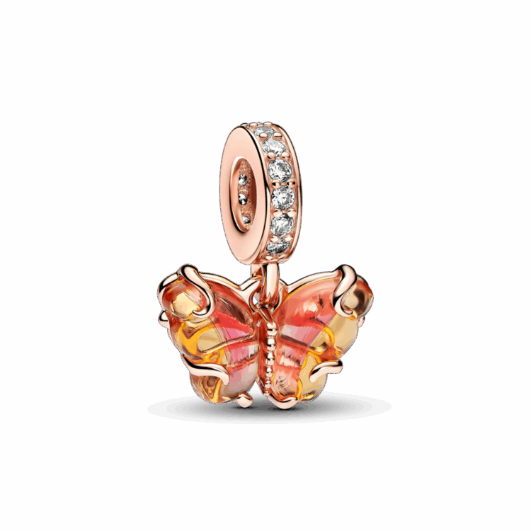 הפכי את עצמך לגרסה הכי טובה שלך עם תליון פרפר בציפוי זהב ורוד 14 קראט, בשילוב זכוכית מוראנו בצבעי ורוד וכתום. מיקרו-חרוזים בגוף הפרפר וזרקונים בשיבוץ פאווה בחלק העליון מוסיפים טאץ מעודן ומנצנץ. הוסיפי אותו לצמיד או לשרשרת שלך כסמל רב עוצמה של תקווה, תמורה והתחלות חדשות.